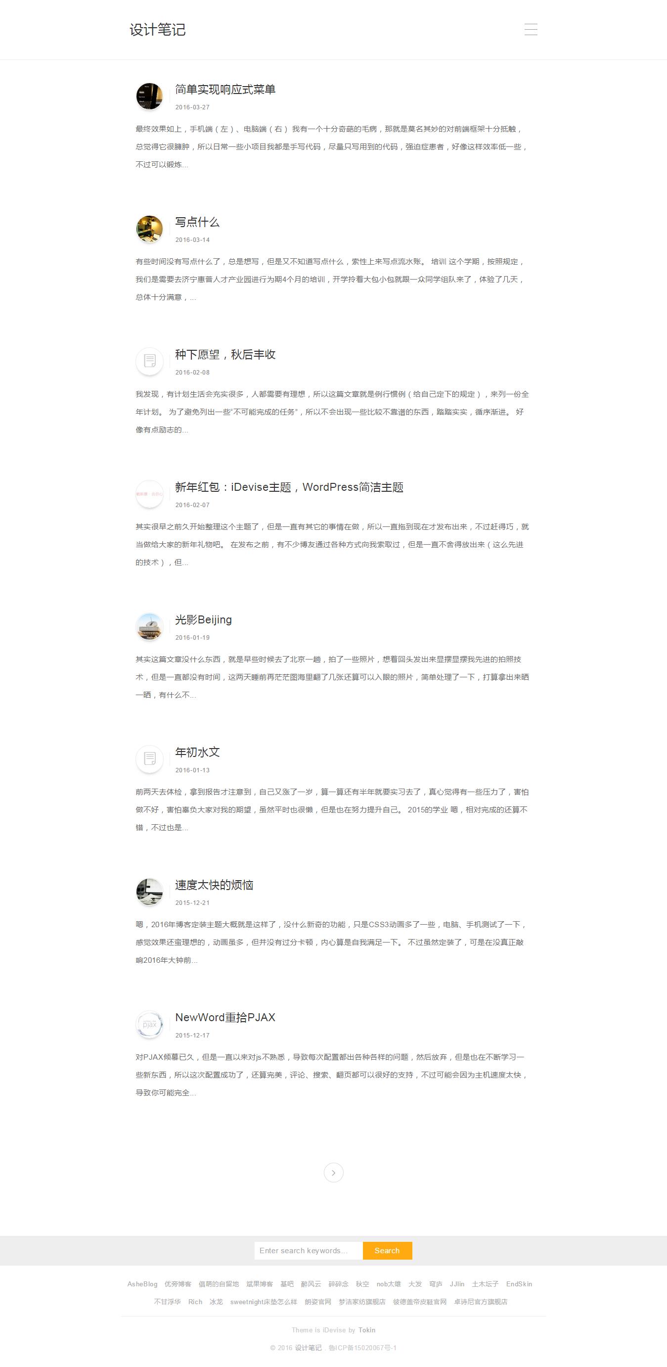 这是一款来自设计笔记的优秀wordpress简洁风格的博客主题--iDevise,可以这样说,iDevise它更像是一种炫技的作品。作者在其中放入大量前端流行技术,并且免费拿出来同大家分享,且它是 免费的、长期维护的
